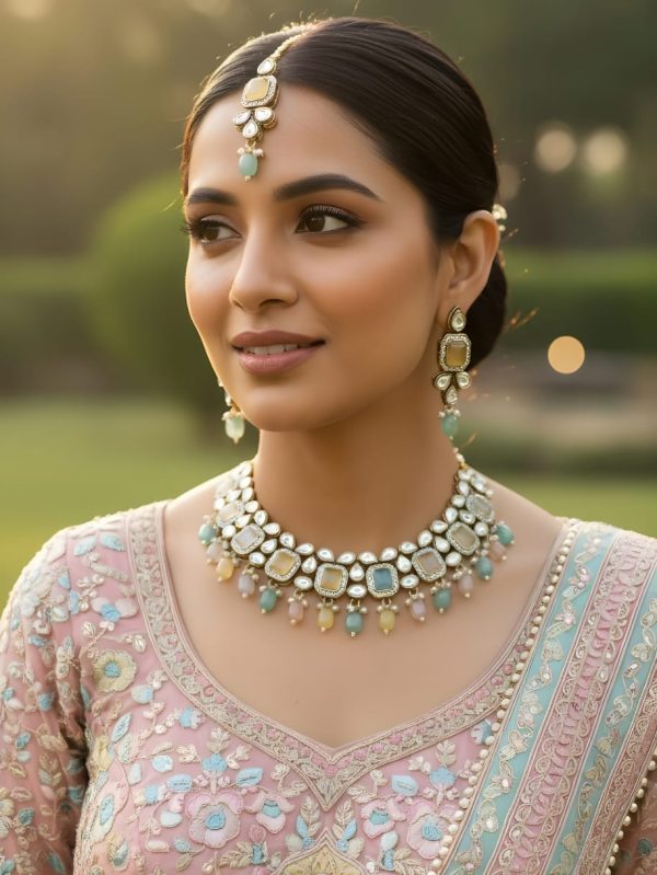 Elegant Multi-Kundan Choker Set with Matching Maang Tikka & Earrings