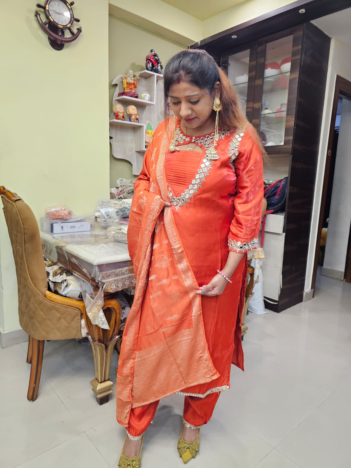 Be the first to review “Fanta Colour Fendi Fabric Suit Set with Banarasi Dupatta (XL)” Cancel reply