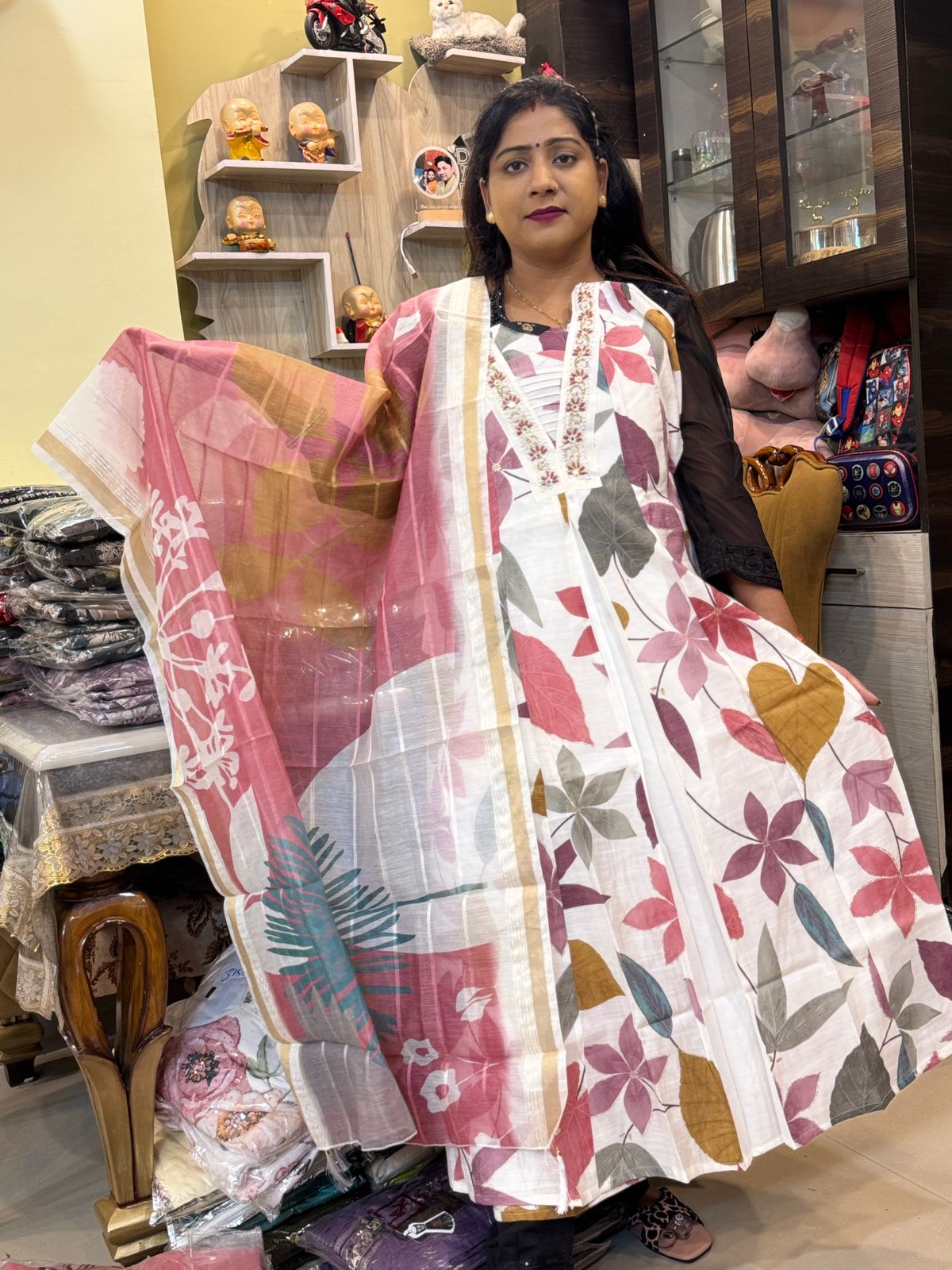 Elevate your ethnic wardrobe with this beautiful floral suit! Featuring a white base with vibrant leaf and flower prints, delicate embroidery on the neckline, and a matching pink dupatta with golden accents. Perfect for weddings, festivals, or any special occasion, this set offers comfort and elegance in every stitch!