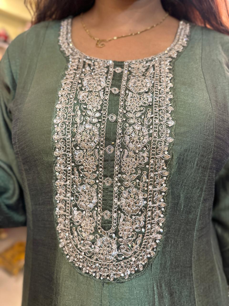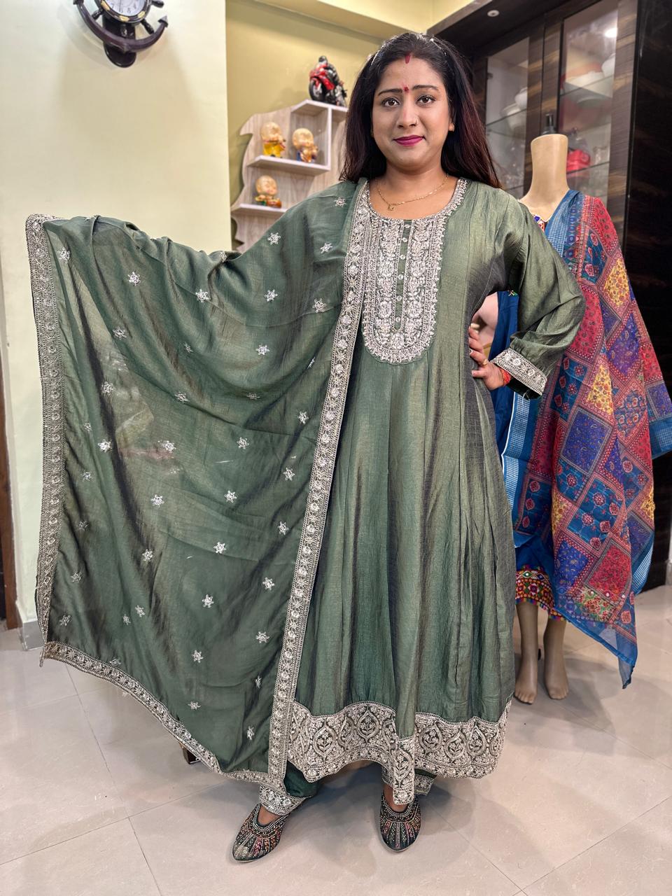 A woman showcases a sophisticated green Anarkali suit, featuring intricate embroidery and a matching dupatta with delicate embellishments.