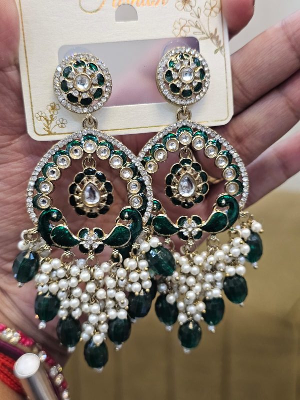 These exquisite chandbali earrings feature intricate Meenakari Gloss detailing, highlighted with sparkling stone accents and a beautifully arranged cluster of beads. The layered drops create a rich, festive look, while the ornate craftsmanship adds a touch of traditional elegance. Perfect for weddings, celebrations, and ethnic wear, these earrings bring a striking blend of artistry and charm to any outfit.