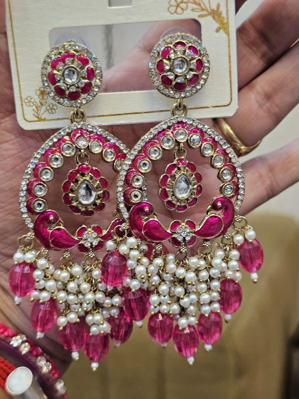 These exquisite chandbali earrings feature intricate Meenakari Gloss detailing, highlighted with sparkling stone accents and a beautifully arranged cluster of beads. The layered drops create a rich, festive look, while the ornate craftsmanship adds a touch of traditional elegance. Perfect for weddings, celebrations, and ethnic wear, these earrings bring a striking blend of artistry and charm to any outfit.