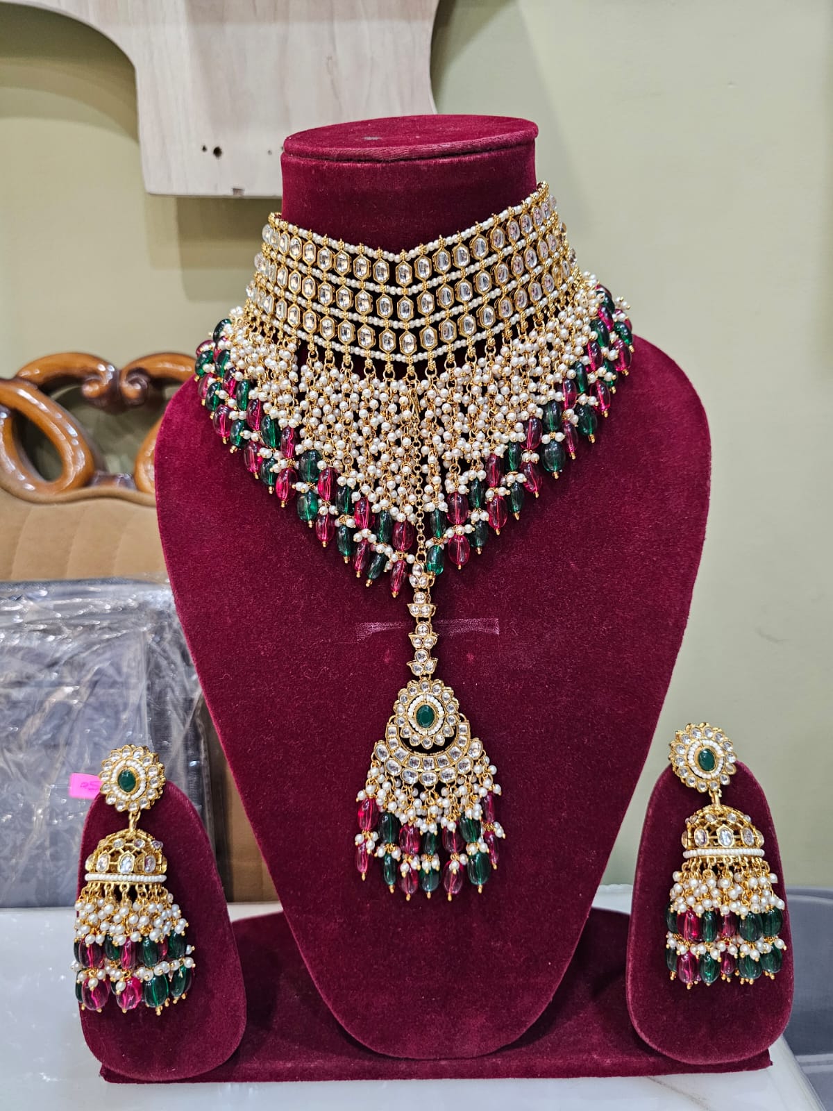 Elevate your bridal look with this exquisite Multi Bridal Choker Set, beautifully designed with intricate detailing. This complete set includes a stunning choker necklace, matching jhumki earrings, and a traditional maang tikka, making it perfect for weddings and special occasions. Crafted for the modern bride who values tradition and glamour, this set adds royal charm and timeless elegance to any bridal ensemble.