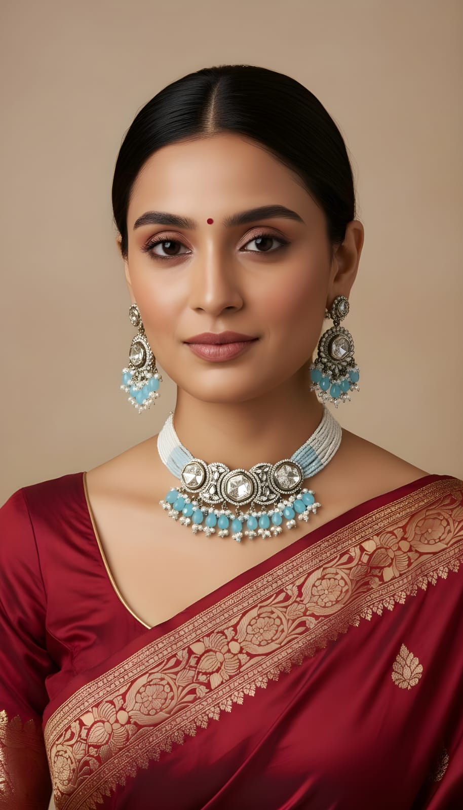 Elevate your traditional look with this stunning Kundan choker set, beautifully paired with soft sky-blue beads and intricate detailing. The multi-strand white and blue beaded choker perfectly frames the elegant Kundan centerpiece, giving it a regal and sophisticated charm.