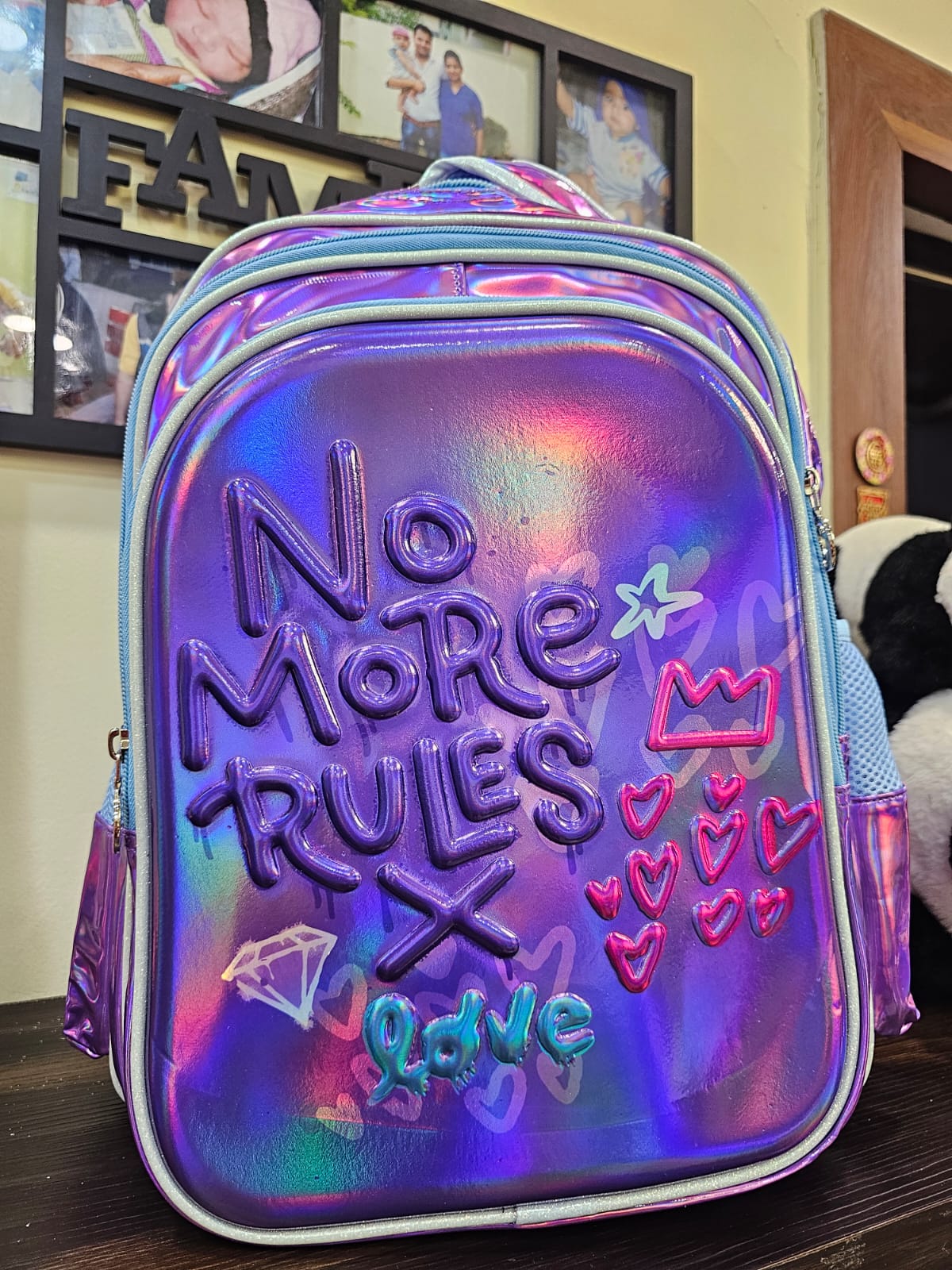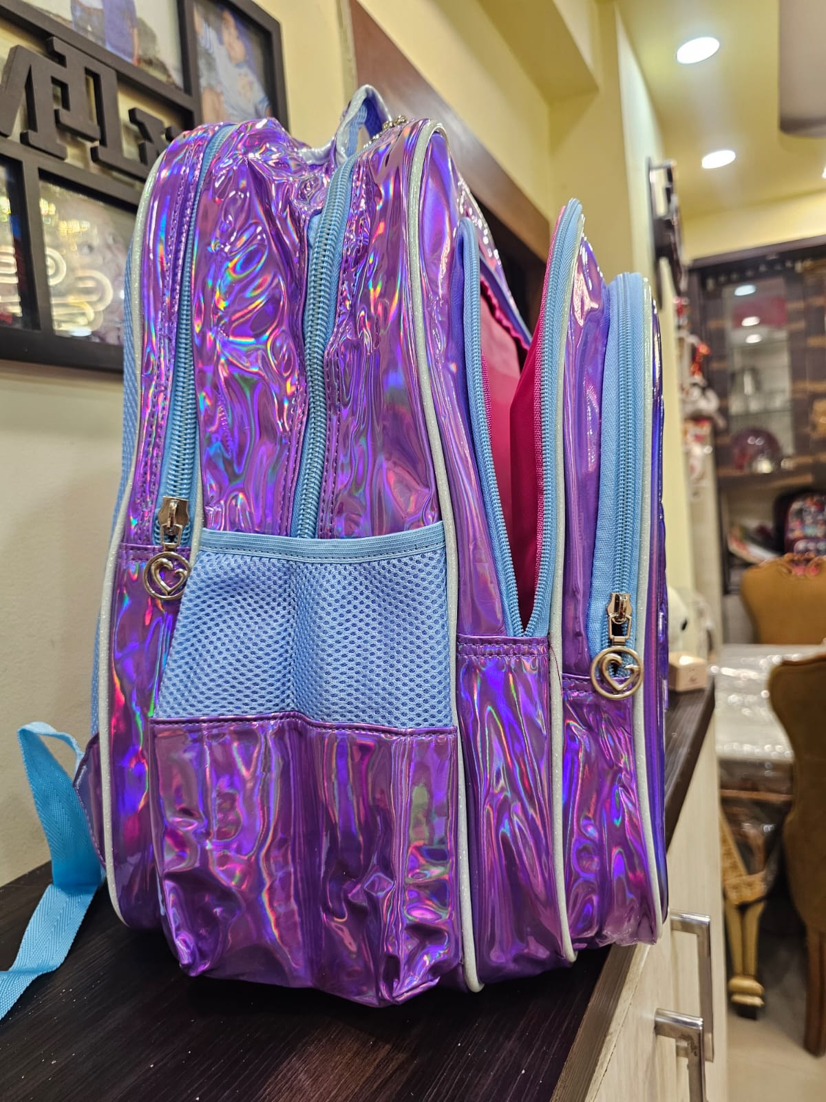 Upgrade your school style with this holographic school bag that comes with many partitions, specially designed in a perfect size for Class 5–7 students. It offers ample space for books, notebooks, lunchbox and essentials. The shiny hologram design gives a trendy look, and the strong straps ensure all-day comfort. Ideal for school, tuition and daily travel.